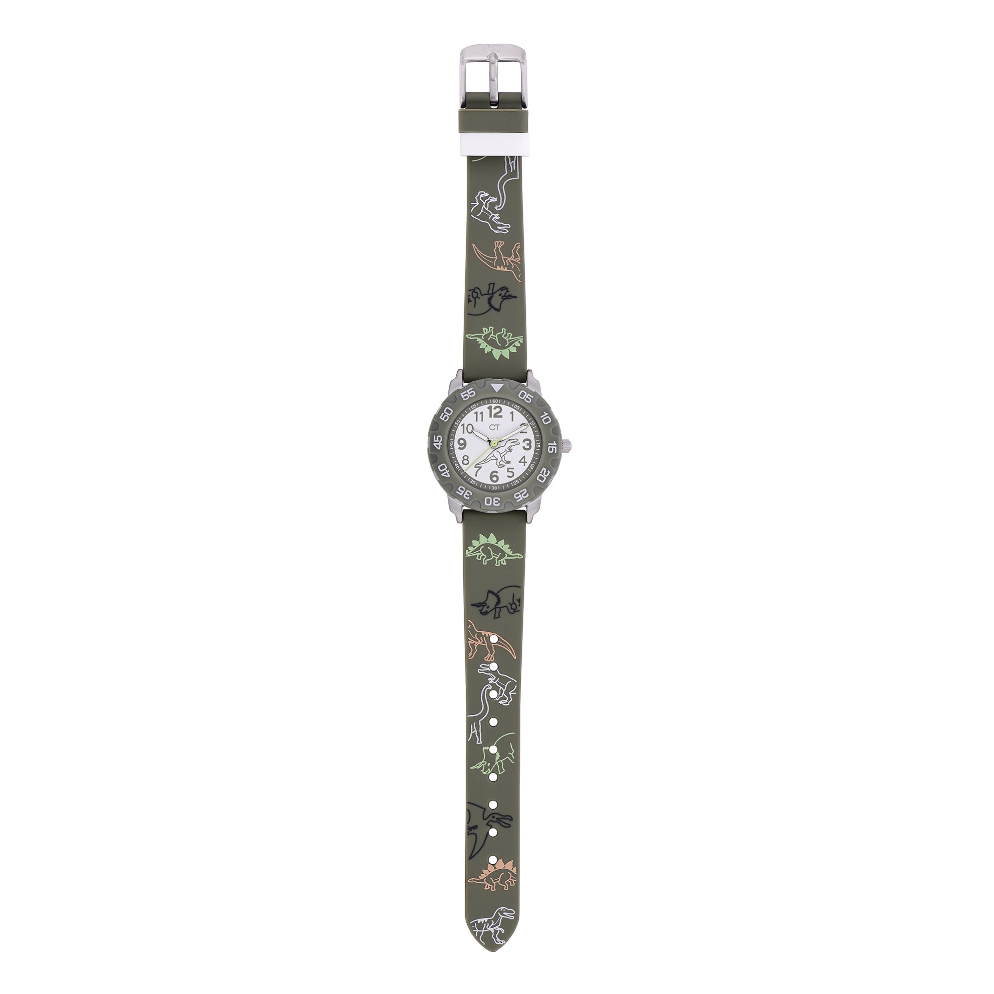 Diese sportlich-coole Kinderuhr mit drehbarem Topring der Marke Cool Time ist für jedes Abenteuer bereit. Neben dem coolem Dinosaurier-Design wurde bei der Entwicklung auch auf die Qualität besonders viel Wert gelegt. So ist die Kinderuhr mit Sillikonarmband schadstoffgeprüft, widerstandsfähig, abwaschbar und sehr komfortabel zu tragen. Dank klarer Zahlen und präzisen Minuteneinteilungen wird das Erlernen der Uhrzeit zum Kinderspiel. Ein zuverlässiges Quarzwerk und kratzunempfindliches Mineralglas runden die Kinderuhr optimal ab. Verpackt im coolen Mäppchen ist die Uhr ein ideales Geschenk und sorgt auch in der Schule für "Cool Time".